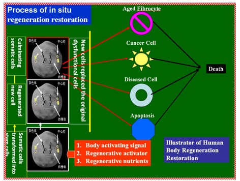 当人体组织器官的细胞出现纤维化、疾病、凋亡和异变时,细胞会释放一种特异蛋白,我们称之为 “细胞死亡信号”,大脑接收到这种信息后会释放再生激活物质进入血液,“潜能再生细胞”在接到死亡信号后被唤醒。再生激活物质参与激活及营养潜能再生细胞的生命活动,同时创造生命条件,促使潜能再生细胞进入干细胞程序,原位启动自身增殖和分化的功能,及时补充器官中的细胞及组织的空缺,及时恢复器官的结构和功能,从而保障器官结构的完整和功能的正常。人体再生复原后,“潜能再生细胞”被激活并加入到人体主体生命功能的发挥中,同时其具有增殖分化的能力,可再生出新的基本生命体,相当于人体增加了一个再生生命,所以说凡是接受人体再生复原科学养生的人,其精、气、神、力都是充足旺盛的,同时具备基本生命和再生生命----“两个生命”。