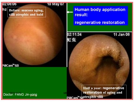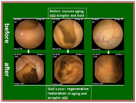 某会员,42岁,胃肠道衰老非常严重。养生前胶囊胃镜表现:小肠粘膜和粘膜下层明显萎缩,变薄,粘膜下血管网及血管袢清晰可见,绒毛稀疏、增宽而短、断裂、退化、部分区域绒毛脱落甚至脱失,隐窝深度变浅。整个胃肠黏膜系统呈现衰老状态。养生一年后胶囊胃镜表现:小肠粘膜和粘膜下层明显增厚,看不到粘膜下血管网及血管袢,绒毛浓密、长度增加,直径增粗,没有明显断裂、脱落、脱失的绒毛粘膜,隐窝变深。整个胃肠黏膜系统完全呈现为年轻健康的状态。这个结果是当前生命科学前沿所不能达到的。器官移植虽然可以,但移植本身是有缺陷的。