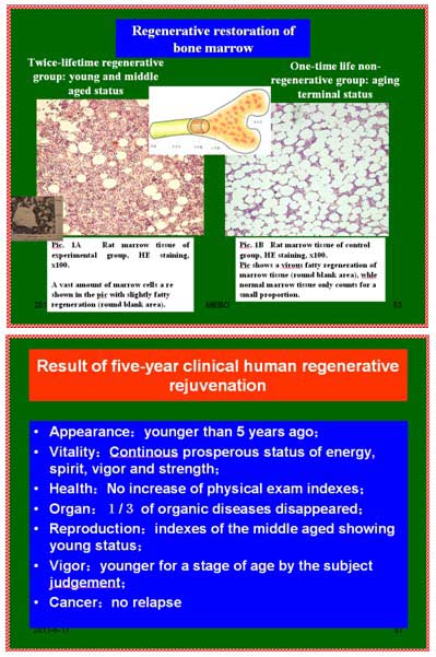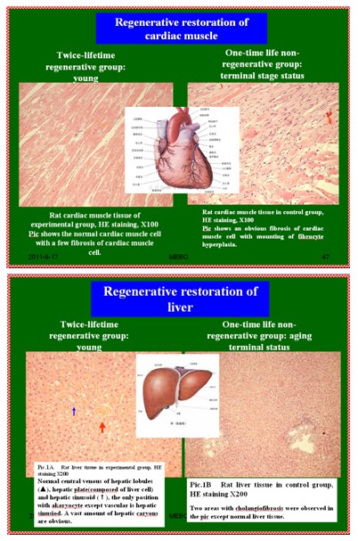 试验证明,大白鼠实现了2倍年龄不衰老,人体就能实现2倍年龄不衰老。我们对每个器官都进行验证。试验结果:用300天雄性大白鼠,相当于人类60岁,一组加再生物质喂养,一组不加再生物质喂养。没有加再生物质喂养的老鼠,在一倍寿命(平均480天)时就衰老死亡了,器官组织学检查确认各器官都衰老于中年。而加入再生物质喂养的老鼠活到两倍寿命时还都活着,通过器官组织学检查,各个器官都处于年轻状态。目前,冠心病、肾脏,肺纤维化等疾病通过再生复原医疗技术,按照人体再生生命定律,器官衰老难题都已经解决了。