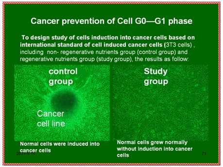 3T3细胞是美国NIH的测试致癌物质的细胞,国际上就用这个细胞来测定一些物质是否致癌。现在我们用一个很简单的实验,就是用已确认的致癌物质诱导正常细胞变成癌细胞实验模型,加上再生物质后,3T3细胞诱导都不变成癌细胞。因为从Go期细胞内各细胞器逐步增加,增加至一定水平后就会进入G1期,G1期时细胞核会分裂产生新细胞,我们却能够阻止细胞进入G1期(这是目前世界研究的空白),我们可以让细胞在即将进入G1期(细胞基因变化完成)时逆转,回到G0期,整个过程全部在人为的控制下(这个实验早在2001年便已经完成)。这个控制依靠的是再生物质,用再生物质量的关系控制这个途径,不是用改变基因的物质控制的。再生物质量多和量少是不一样的,量少则达不到启动再生程序要求。再生物质的量决定了细胞内细胞器的量,使得细胞器的代谢旺盛,所以我们的结论是用细胞代谢来控制生命,用控制细胞的代谢实现了人体的再生。而不是用改变细胞属性的方法来控制生命,我们一直的观念就是“任何改变生命属性的研究都是反人类的”。这是我们对癌症的研究情况,癌症已变得很简单,而其他人把研究癌的方向集中到细胞核里的遗传物质去了,研究方向搞错了。