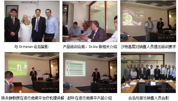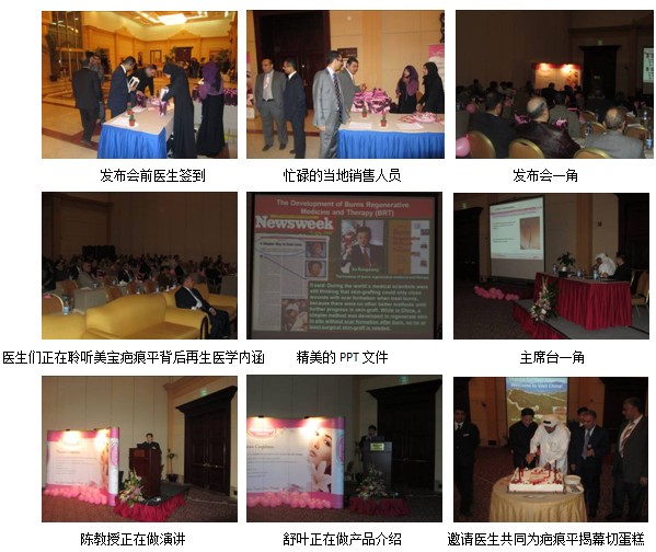 自2011年疤痕平软膏在中东地区数个国家拿下CPP(Certificate of Pharmaceutical Product)药品证书之后,美宝疤痕平已正式以药品身份进入医院销售渠道。在美宝国际市场集团及其合作伙伴海湾Julphar药厂积极的组织安排下,分别在沙特三大城市吉达、达曼、利雅得成功举办产品发布会,共计有来自各市医疗机构的440名临床医护人员参加了产品发布会。其间,访问了当地重点医生13名,会诊病例5名,直接培训当地一线销售人员25名。培训团队由来自中国烧伤创疡科技中心临床部主任、北京荣祥再生医学研究所副所长、北京中西医结合学会烧伤专业委员会副主任委员、中国烧伤创疡杂志社副社长的陈永翀教授及美宝国际集团产品部主管舒叶组成。培训内容包括疤痕治疗选择、疤痕形成原因、疤痕平组成成分、再生医学-抗疤痕机理、疤痕平临床使用方法、美宝疤痕平联合无创或有创方法治疗各种疤痕的典型病例介绍等。具体情况报道如下:
