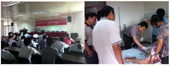 2012年6月4日下午,应广东省东源县中医院叶勇主任之邀,中国中西医结合学会烧伤专业委员会常委兼秘书、《中国烧伤创疡杂志》副总编辑、北京美宝烧伤创疡研究所副所长、第二临床研究部主任王洪生研究员到医院做“再生复原疗法在深度烧伤及难愈性创面治疗新进展”专题学术讲座。广东省东源县中医院全院的医护人员均参加了此次培训,张干华副院长主持了会议,在学术讲座中,王主任首先向与会的专家介绍了著名生命科学家、医学家、人体再生复原科学的创立者、再生复原疗法的发明人徐荣祥教授近年来在再生医学领域所取得的重大实验及临床研究成果,而后王主任结合了大量的临床病例图片及录像资料,主要针对深度烧伤及各类难愈性创伤、溃疡创面的规范化处理方法与技巧、注意事项等进行了细致地讲解,在座的各位医护均被这神奇的疗法折服。会后,医护人员向王主任询问了临床上所遇到的问题,王主任一一作了详细解答。该院张干华副院长作总结发言时,高度赞扬了再生复原疗法,称之为一种“为患者带来福音”的疗法。随后,应外科叶勇主任的邀请,王主任亲自对一名褥疮病人患者进行了会诊,并提出治疗建议。