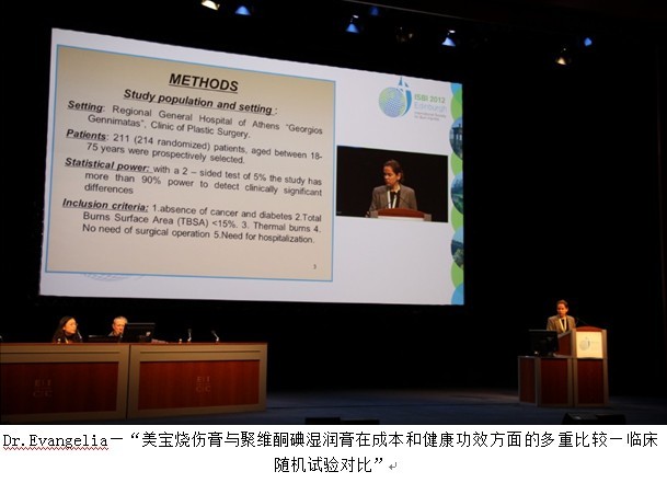 最后压轴出场的是来自希腊的烧伤治疗专家Dr.Evangelia Tsati,她以“Comparing cost and multiple health outcomes between oil baded ointment and povidone iodine plaus moisturizing cream under different aspects: A pragmatic Randdomized Trial”为题介绍自己参与的在希腊进行的多中心临床对比试验,演讲包含了大量的对比数据和科学论证,从治愈时间、治疗便捷性、病人痛苦程度、治疗费用等多个方面进行了详细的对比阐述,结果显示美宝在病人愈合时间、住院时间以及整体花费上全部优于对照组!由于时间问题,她没法答疑,但是会后作为唯一的女性演讲者,她获得了所有专题会听众最高的评价—“科学和完美的演讲”!