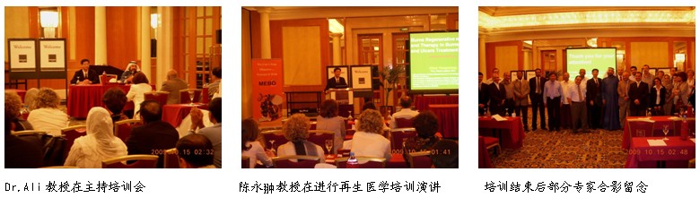 阿联酋是较早注册美宝湿润烧伤膏(MEBO)和引进烧伤再生医学技术的中东国家之一,经过十多年的发展,其OTC方面取得了较大成功,市场占有率已经超过90%,MEBO在临床医师和百姓当中的知晓度是非常高的,部分医师广泛的将MEBO应用到除烧伤以外的各种创疡病也取得了不错的临床效果。但是,由于多年来阿联酋市场没有得到连续有效的技术支持和临床指导,致使阿联酋乃至整个中东地区在大面积烧伤的救治和临床规范应用方面还存在相当的不足。为了改善这种现状,应阿联酋多家医院和阿联酋海湾JULPHAR药厂的邀请,2009年10月,中国烧伤创疡科技中心临床部主任、中国中西医结合学会烧伤专业委员会委员、北京中西医结合学会烧伤专业委员会副主任委员陈永翀教授,应邀对阿布扎比市和迪拜市的160多名主要的烧伤、整形医师、皮肤科医师、普外医师、骨科医师等进行了烧伤再生医学与疗法、临床治疗规范等内容的培训,培训活动非常受临床医师的欢迎,大家都为该技术在基础研究、大面积深度烧伤和在创疡领域的治疗所取得的巨大进展和获得的理想的临床疗效感到震惊。经过这次培训,大家觉得学到了很多新的知识,获益颇丰。下面以图片的方式做一个简报。