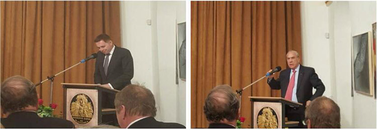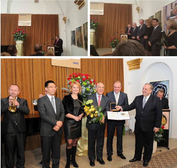 美宝国际市场总经理刘钢与区域经理张印与欧洲非正式经济论坛主席Peter Kasalovsky及斯洛伐克第二任总统鲁道夫·舒斯特(Rudolf Schuster)进行了友好交流。作为在整个欧洲乃至世界多个国家和区域的政治、经济、社会、人文等领域始终保持着活跃角色及深远影响力的欧洲非正式经济论坛主席Peter Kasalovsky表达了对徐荣祥教授的深切怀念,他说:“徐荣祥教授是我的兄弟、好朋友,他虽然不能再参加我们的活动,但是在我们心里一直怀念着他。此次颁奖大会特意为他留了一个空位,座位上放着他照片及纪念邮票,代表着徐教授也参加了这次盛会。”