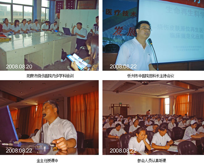 2008年8月22日,金党军主任和靳伟经理又在忻州市中医院对全院的临床医护人员做了“烧伤皮肤原位再生医疗技术学习培训”,参会人员140多人。忻州市中医院是综合实力较强的三级乙等医院,该院以前只在小面积病人方面应用烧伤皮肤原位再生医疗技术,经过这次培训,该院医教科田科长说,争取在以后工作中能够多次合作,在条件允许时候我们把烧伤和创疡、创伤、溃疡病人单独成立一个特色专科。会后金党军主任对外科、皮肤医护人员提出的问题做了详细的讲解,大家表示通过这次讲座受益匪浅,增长了不少新的知识,真正了解了我国皮肤原位再生医学的发展,感谢徐荣祥教授研究创立了造福患者的好技术,感谢中西医结合学会烧伤专业委员会金主任带来的新知识。并希望中国中西医学会烧伤专业委员会和北京美宝烧伤创疡研究所继续给予支持帮助,进一步加强合作。通过讲座,学习交流等形式把徐荣祥教授创立的生命再生科学及皮肤原位再生修复理论融会贯通传播到每个医护人员中,从思想上,概念上认识再生医疗技术的创立与发展,用最适宜基层应用的技术造福广大烧伤、创疡,创伤、溃疡等多发病常见病患者。促进中西医临床结合的更快发展。