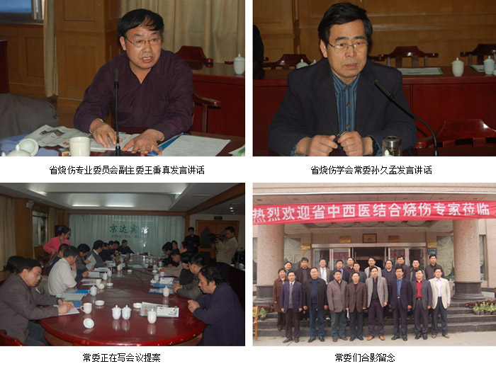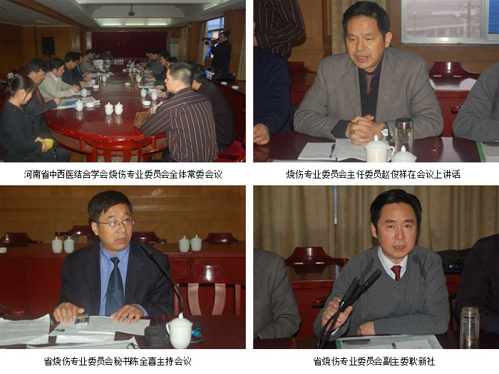 河南省中西医结合学会烧伤专业委员第一次常委会议于2009年3月21日在河南省南阳市京达宾馆召开。参加会议的来自河南省的17个地市的常委、专家,他们分别是::刘润文名誉主任委员(河南宏力医院主任)、赵俊祥主任委员(河南大学附属南石医院院长)、惠雷副主任委员(河南大学第一附属医院烧伤科主任)、耿新社副主任委员(郑州市新密市中医院院长)、王秉真副主任委员(漯河市第一人民医院烧伤科主任)、李华强副主任委员(河南大学人民医院副院长)、李天宇副主任委员(河南大学附属南石医院烧伤科主任)、陈全喜秘书长、赵俊国秘书长、陈振宇常委(许昌市烧伤医院院长)、孙久孟常委(安阳市151医院烧伤科主任)、蔡玉娥常委(商丘市第一人民医院烧伤科主任)、崔正军常委(郑大一附院烧伤整形美容科主任)、李志刚常委(洛阳市中心医院烧伤科主任)、李长明常委(周口烧伤医院院长)、张彬宇常委(新乡市第二人民医院烧伤科主任)、毛登丰常委(濮阳市中医院烧伤科主任)、邢伟常委(焦作市中医院烧伤外科主任)、赵俊国常委(鹤壁市第二人民医院烧伤外科主任)、娄季鹤常委(郑州市第一人民医院烧伤科主任)、李志倩常委(河南大学附属南石医院烧伤科护士长)。