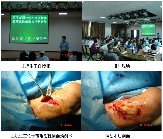 当日下午三点,由该院外科苏主任致欢迎辞并宣布培训开始,由王洪生主任以“再生复原疗法在深度烧伤及难愈合创面治疗新进展”为题做了专题讲座,来自该院各科室100余名医护人员参加了此次培训,王洪生主任在介绍我国著名生命科学家、医学家徐荣祥教授近年来在人体再生复原科学领域取得的重大临床与实验研究成果后,从再生医学的理论到该技术治疗烧伤、褥疮、糖尿病足、各种难愈合创面、疤痕防治及各科室运用的临床治疗规范做了详细的讲解,参会人员均被再生医学神奇的治疗效果所震惊。