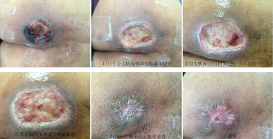 2014年深秋一名来自太原北部郊区的农民患者,身患严重的腰椎间盘突出症状,给生活劳动带来诸多不便。经医院诊断,确诊后腰椎管狭窄,腰椎第4、5间盘突出,经医患沟通后同意行①椎间盘射频热凝术。②椎间盘开放手术加钢板手术。术后发生左下肢去神经皮肤症状(无疼痛感觉)科室采用综合医诊,包括针灸按摩等,12月下旬,行艾灸针灸时,因艾卷脱落,将臀部皮肤深度烧伤(深Ⅲ°)。2015年元月3日,北京烧伤创疡研究所副所长赵瑞庆教授应邀前往该院进行会诊,在该院颈椎疼痛科医务人员的积极配合下,及时清除焦痂样深部坏死组织,局部用药改用徐荣祥教授创立的烧伤创疡再生医学与疗法,10天后创面发生了可喜的变化。坏死组织清理液化完毕,新生的肉芽开始生长。25天后肉芽生长达到高峰值状态,将创口完全填充丰满。36天创面完全封闭。春节后赵教授随访病人时,患者非常激动地说到:感谢赵教授多次来院给我看病,我的伤口采用新方法治疗,中间没有发生感染,一个多月就好嘞,我太高兴了!