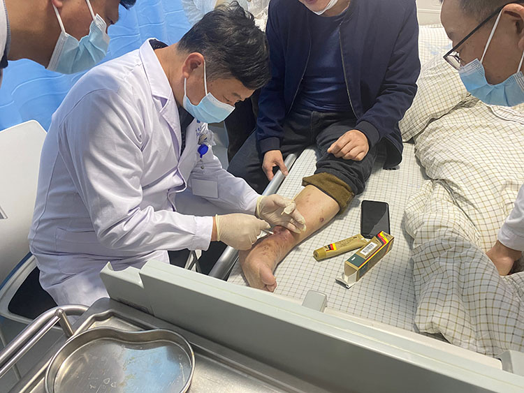 2023年12月18日张强教授应湖北省宜昌市夷陵人民医院邀请,会诊一例右脚底三度烧伤患者