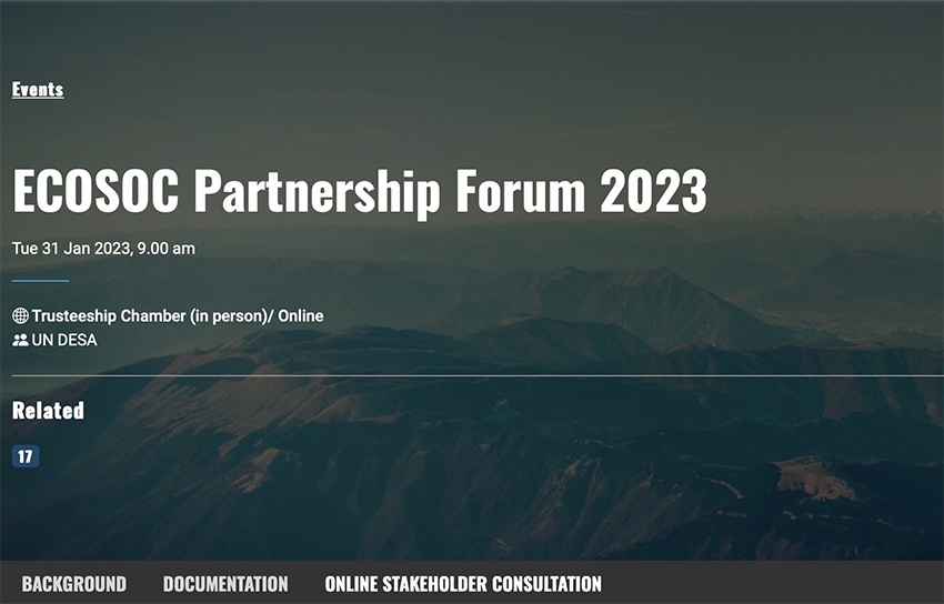 联合国经济及社会理事会(ECOSOC)2023年伙伴关系论坛将于美东时间2023年1月在纽约联合国总部举行,而基于 “加快新冠疫情(COVID-19)后修复,全面落实2030年可持续发展议程”的目标,联合国经济及社会理事会旨在通过汇集联合国各成员国和利益攸关方——包括国际组织、地方政府、非政府组织、私营部门、民间社团以及科学家、学术界、妇女、青年等——以创新方式,推动联合国可持续发展目标(SDGs)的实现,并特别强调伙伴关系在这方面可发挥的重要作用。