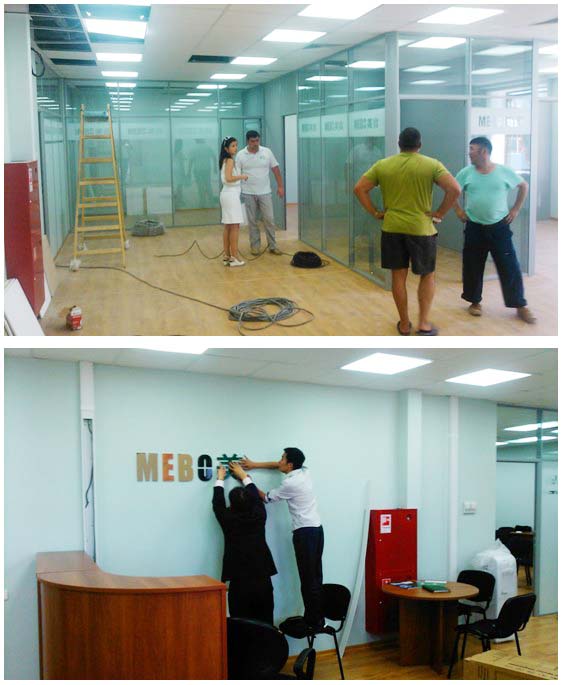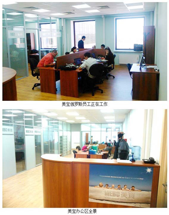 美宝俄罗斯分公司坐落在格林伍德国贸中心的核心区——17号商务办公楼,租用建筑面积203平米,根据业务需求内部布局分为接待沟通区、公共办公区、会议培训区、经理室、财务室、周转库等几部分。分公司筹备组迅速开展各项准备工作,落实公司注册、招聘培训本地员工,按项目进度完成了从设计装修、家具采购、到布线安装、设备调试等一系列营运准备工作,大家亲自动手布置装饰办公室,即节省了费用又促进了沟通,将美宝再生复原科学的旗帜插到了莫斯科。