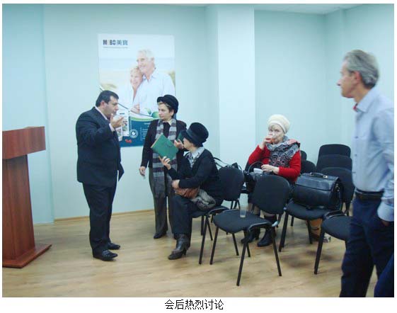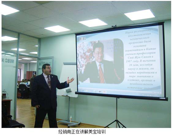 11月20日国际市场集团总裁班子委员, 市场部总经理刘钢专程来莫斯科了解指导市场开发工作,并协调解决产品物流问题。借总部领导来临的东风,分公司一周内举办了两场小型公司招商说明会,宣讲美宝公司的历史和发展,人体原位再生复原科学技术和产品应用,美宝直销业务带来的健康财富机会,一些参会人对美宝再生科学和产品的神奇效果所震惊,在会后就直接报单购买加入美宝。
