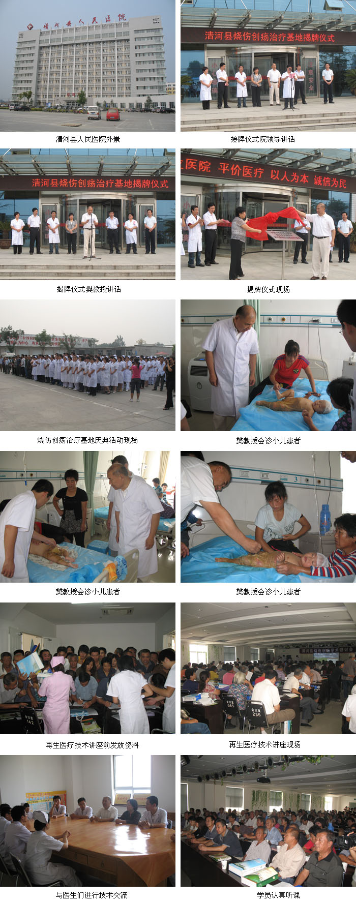 2010年9月15日,清河县人民医院迎来了建院62周年和烧伤创疡基地医院挂牌双喜临门的好日子。中国中西医结合学会烧伤专业委员会河北区办事处主任王琳琳及办事处的工作人员陪同中国中西医结合学会烧伤专业委员会委员樊兆宗教授参加了庆典活动和烧伤创疡治疗基地的挂牌仪式。清河烧伤创疡治疗基地被称作是一项造福百姓的民生工程,从基地筹备到成立都受到了县委县政府、卫生局领导的高度重视和大力支持。上午九点庆典活动正式开始,县领导和卫生局领导先后致贺词,对清河县人民医院62年来取得的成绩给予了肯定,对烧伤创疡治疗基地的成立表示衷心祝贺,对再生医疗技术给予了高度赞扬,同时希望医院通过这项民生工程造福更多的患者。参加这次庆典活动的相关部门领导及医务人员共500余人,当地电视台为此进行了全程报道。