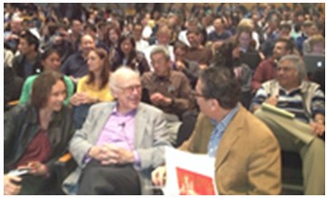 罗恩•埃文斯(右)交谈。第二排穿棕色衣服的是诺奖得主罗杰钱。