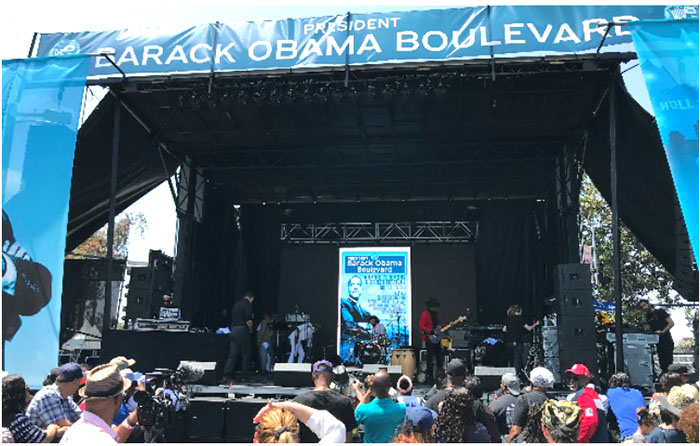 下午5点半,洛杉矶市长埃里克·加切蒂和洛杉矶市议会主席赫布·韦森率领一众市议员在主席台上正式宣布罗德奥路改名为奥巴马大道并为新街牌揭幕。