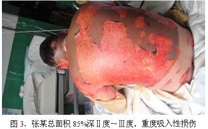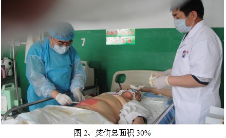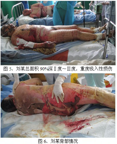 北京烧伤创疡研究所医疗部主任王广顺教授于2011年4月30日下午19:15分,应该院杨院长、张西军主任、马思泉主任的邀请,在山东省办事处刘玉芳同志陪同下来到该院重症监护室查看了3名烧伤患者,他们都是伤后时间约20个小时左右,分别是太阳能热水器故障烫伤总面积30%、脑外伤、头皮裂伤;锅炉爆炸烧伤张某烧伤总面积达85%TBSA,为深Ⅱ度~Ⅲ度烧伤,重度吸入性损伤;刘某烧伤总面积90%TBSA,为深Ⅱ度~Ⅲ度烧伤,重度吸入性损伤。前者处在嗜睡状态,后二者血小板仅54×109/L,张某尿色深混浊,7个小时内尿量仅300ml,躁动不安,创面肿胀、硬无弹性。王教授立即对Ⅲ度创面进行“切划减张疗法”,并涂美宝湿润烧伤膏及用美宝创疡贴止血治疗。平衡盐液纠正水电介质酸碱紊乱、20%甘露醇125ml-速尿20mg-利多卡因50mg-654-25mg组成的利尿合剂、血必净、生脉注射液、补充血小板等全身治疗方案,目前患者血小板已回升、尿量增加,病情逐渐稳定。