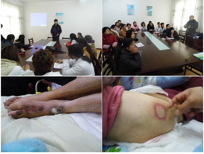 湖北省区黄彦勇陪同金老师顶风冒雨,来到黄州区人民医院。正在创立中的黄州区老年公寓,是属于医疗养老范畴的一种新型模式,设计同时能容纳300人左右护理能力的中型公寓,由黄州区人民医院选派有经验的医师及护理人员,初级阶段收养了60多位老年人。金党军老师在讲课前与王飞燕主任做了沟通,之后为全体医护人员做了再生医疗技术对烧烫伤,以及压疮、各种难治性溃疡的治疗原理和原则,结合实例图片视频,对学员们感兴趣的压疮护理,糖尿病足治疗方案等老年病患等,做了深入浅出的讲解。
