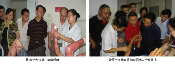 当天上午,来自各地的51家医疗单位的100余名参会代表陆续到会签到,会务组改变以往学员直接进入会场的做法,而是按预定方案将报到学员分批带到武警四川省消防总队医院烧伤整形科病房,对住院治疗的28名患者逐一观摩,并且分别由主管医生介绍治疗情况,同时回答学员提问。