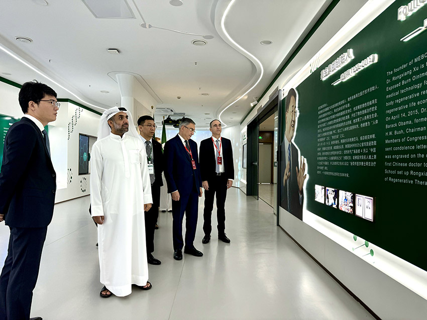 注:阿联酋全称阿拉伯联合酋长王国,共由7大酋长国组成,其中首都阿布扎比(Abu Dhabi),经济中心迪拜(Dubai),哈伊马角(Ras Al Khaimah)为第四大酋长国,是阿联酋的工业中心,其中海湾大药厂是中东最大的药品制造商。Sheikh Saud Bin Saqr Al Qasimi 是前哈伊马角酋长国Sheikh Saqr Bin Mohammad al-Qasimi酋长之子,2010年10月,Sheikh Saqr Bin Mohammad al-Qasimi去世后,Sheikh Saud接任酋长,随后实施了一系列快速发展哈伊马角的经济政策,包括成立哈伊马角政府投资中心(RAK Governmental Investment Authority)。1980年Sheikh Saqr Bin Mohammad al-Qasimi成立阿联酋海湾大药厂(Gulf Pharmaceutical Industries, 简称Julphar),并于90年代初期结识徐荣祥教授,引入了湿润烧伤暴露疗法及产品。随后Sheikh Saud Bin Saqr Al Qasimi及其弟弟Sheikh Faisal Bin Saqr Al Qasimi先后担任Julphar董事局主席,30多年来一直保持与美宝集团董事局的亲密友好,快速推动了双方战略合作及在中东、非洲、拉丁美洲的国际市场布局。目前Julphar新任董事长Sheikh Saqer Bin Humaid Al Qasimi同样为Al Qasimi皇室家族成员。