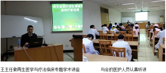 2012年11月27日,中国中西医结合学会烧伤专业委员会常务兼秘书、《中国烧伤创疡杂志》副总编辑、北京美宝烧伤创疡研究所副所长、第二临床研究部主任王洪生研究员应重庆市江陵医院的邀请来到该院,为全院医护人员做了一场精彩的学术讲座。听取此次学术讲座的有该院泌尿外科、肛肠外科、骨科、脑外科、胸外科、妇产科、皮肤科、口腔科、五官科、精神科等科室近60余人参加。下午3点培训会准时开始,王主任以“再生复原疗法在难愈性创面治疗新进展”为题做了精彩的学术报告,全面讲解了再生医学的相关概念,并结合大量的病例图片讲解了再生医疗技术骨外露、钢板外露、糖尿病足、褥疮等各种难愈合创面的治疗过程及要点,讲解了再生医疗技术在各个临床科室的应用。此场报告深深的震撼了在场的每一位医护人员,会议结束后,大家还不愿离去,争先恐后的提问,王洪生研究员都一一解答。