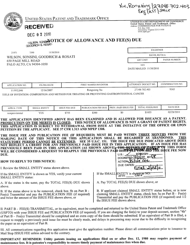 在辞旧迎新之际,集团的喜事不断,礼包不断,近日,再接到从美国专利局传来的振奋人心的喜讯,再生生命科学创始人徐荣祥教授的“治疗与预防胃肠道癌症方法”的专利已获得正式授权。该专利是继徐教授在获得系列专利权之后,在人体再生复原科学研究和科学成果确认的又一重大进展与突破。至此,徐教授已获得美国、日本、欧洲、加拿大等主要国家23项发明专利。再一次证实了在生命科学领域,话语权牢牢的掌握在美宝人手中,在知识产权发展过程中的具有重要意义“治疗与预防胃肠道癌症配方和方法”是美宝科研成果实际临床应用的重要成就,近年来,胃肠道癌症的发病率居高不下,严重威胁着人类生命健康,传统医疗手段效果不佳。该专利技术的问世,不啻是为人类健康带来的天大福音。根据这一专利开发的技术和产品,可以利用人体的再生潜能,为解决人类胃肠提前衰老,治疗和预防癌症的发生,为目前医学手段难以解决的胃肠道癌症预防与治疗提供了全新的解决办法,以徐荣祥教授为核心的美宝科研团队在再生生命科学领域里所取得的这一前沿临床应用成果,为人类再生生命科学发展道路上具有新的里程碑式的意义。