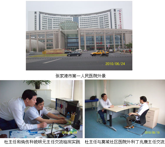 中国中西医结合学会烧伤专业委员会常委、中国烧伤创疡杂志常务编委、北京烧伤创疡研究所临床部杜福勤主任和学会驻江苏办事处周园园同志于2010年6月18日~25日,一同走访了无锡市滨湖区人民医院外科、锡山区东亭社区医院、宜兴市人民医院烧伤科、苏州市苏大附属医院整形科、苏州市立医院北区(苏州市三院)烧伤科、常熟市莫城社区医院、张家港市第一人民医院烧伤科,同时走访了两家医药公司和五家终端大药房。