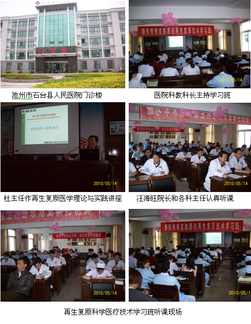 2010年5月14日,应石台县人民医院汪海旺院长和外科韩军主任之邀,中国中西医结合学会烧伤专业委员会常委、北京美宝烧伤创疡研究所临床部杜福勤主任与中国中西医结合学会驻安徽片区张朝军主任、陈义胜同志一同来到石台县人民医院,在该院的会议室举办了烧伤创疡原位再生复原医疗技术学习班讲座。会议由科教科长主持,参加会议的有汪院长、韩军主任及外科、内科、骨科、妇产科、皮肤科、耳鼻喉科、肛肠科的医护人员,共计100余人。