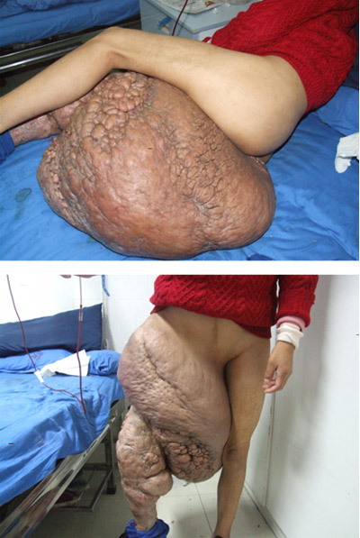 患者邵某,女性,38岁,南通如东人。1983年,12岁的她在一次骑车过程中弄伤右踝部,出现红、肿、热、痛等感染征象,未引起足够重视,在当地医院简单处理后略有好转,随后几年症状反复发作,并逐渐向大腿部发展,患肢愈发变粗,小腿皮肤也出现溃烂,在换药治疗无效后,1994年,23岁的邵某不得不在其当地医院接受手术治疗。然而,这次手术并未能让她从痛苦中解脱,手术后不久症状复发并进一步加重,并在大腿根部形成肿瘤。15年来,肿瘤不断增大,近两年肿瘤增长尤其明显,以致患者丧失了劳动能力,严重影响了其日常生活。在其家人的帮助下,患者四处求医未果,遂于今年2月10日来我院就诊,拟“右下肢巨大包块”收住入院。