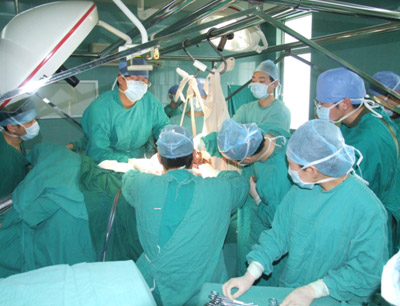 3月1日上午8点,我院手术室里一片繁忙景象,经过医护人员1个半小时的努力,克服了巨大肿瘤造成的困难,术前患者体位合适,麻醉成功。9点50分,手术正式开始,由我院整形烧伤科赵贤忠主任与上海长征医院整形外科江华主任共同主刀,麻醉由经验丰富的顾仁勇主任和邢春花主任主持,陈松院长亲临现场协调。为了便于手术,肿瘤被特制的布兜悬吊于半空,布兜的两端被固定在专门为这次手术特制的手术架上。专家们在助手的配合下,按照预定方案切开皮肤,沿着肿瘤边缘小心分离,对肿瘤根部粗如手指的血管仔细分离、钳夹、切断、双重结扎,凭借着娴熟的技术,仅仅3个小时后,折磨患者达15年之久的肿瘤就被完整地切除下来,流失液分的肿瘤就像一只匍匐着的海豹。接下来的任务,是如何更好的修复创面,同时避免新的创面形成。