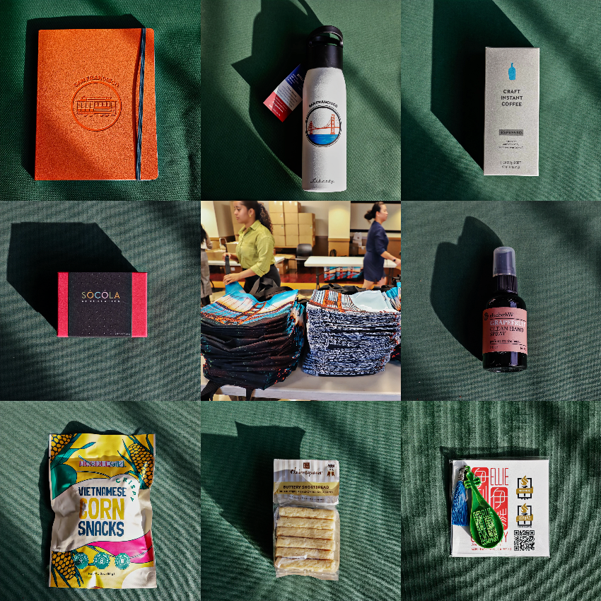 礼品袋中包括撒切尔夫人的爆米花,真正的“旧金山风格”的美味爆米花,从提拉米苏到墨西哥青椒,多种口味可供选择;铭刻着“旧金山”和这座城市标志性交通方式的日记本;印有金门大桥标志的环保水瓶;印有金门大桥、阿拉莫广场和缆车图案的Socola巧克力;香味独特的伊丽莎白洗手喷雾;MIAGE唇蜜,这款唇蜜来自于治疗一位面部被烧伤的阿联酋公主的神奇配方,由内而外呵护双唇,并已经发展成为系列护肤品;还有可以让你在漫长会议中迅速恢复精力的蓝瓶速溶咖啡;艾莉和伊娃公司定制版的刻有APECSF23字样的钥匙链;令人难以抗拒的甜咸俱全且超级脆的越南玉米小吃;以及美味的Clairesquares酥饼。