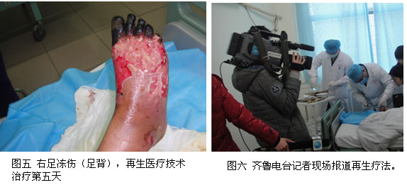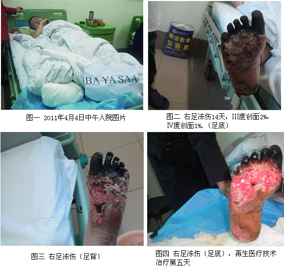 蒙古国20岁小伙子巴亚萨(音译)是一名大二学生,2011年3月22日,蒙古下了一场大雪,巴亚萨在户外做事时右脚被冻伤。12天后,巴亚萨的脚掌、脚背溃烂,5个脚趾都变成黑色,当地医生建议截肢,巴亚萨家人表示不能接受。巴亚萨有一位亲戚在中国读博士,2011年4月3日,她通过“王广顺好大夫在线”网站得知106医院正在推广应用再生医疗技术,能治疗小伙子的右脚,可以不截肢。4月4日早上,巴亚萨在母亲陪同下从乌兰巴托乘飞机来到济南106医院。在各媒体热心帮助下蒙语翻译帮巴亚萨办理了住院手续,当天王广顺教授应用湿润烧伤膏及创疡贴为其换药治疗,患者疼痛明显减轻。第二天换药时,肉芽创面由红转淡,创面液化物增多。第三天换药时见创面渗出物减少。第四天已见皮岛长出。第五天,Ⅳ度创面坏死组织部分分离,伤口已明显缩小。通过王广顺教授的精心治疗下,现在巴亚萨的伤情已得到了好转,右脚小踇趾已恢复血运,其他4个脚趾仍是黑色的。王教授按干细胞周期为他制定了四周的恢复方案,如果治疗顺利,巴亚萨可以不用截肢,一月左右就可回国。(报道再续)