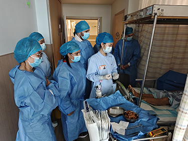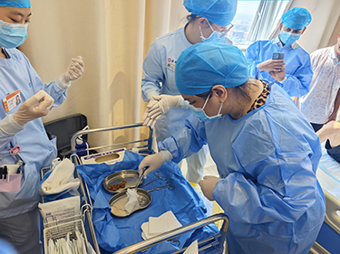 交流会结束后,代表团前往烧伤整形中心病区进行观摩,深入了解了天然气爆炸造成的大面积烧伤患者、热水泥导致的头面部烧伤患者等的治疗流程。代表团积极协助创面专科护士进行换药,通过实践操作及床旁讲解更加清晰地了解到换药过程中的操作要点,以及再生医疗技术联合多技术治疗的优势。