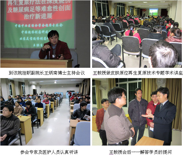 在学术讲座中,王教授首先向与会医护人员介绍了我国著名生命科学家、医学家徐荣祥教授在人体再生复原科学领域取得的实验及临床研究最新进展,在2010年年底公布的“人体生命延续之谜(二)——线粒体主导日常生命”,破解了“精、气、神、力”旺盛与人体启动了再生生命程序有关,与细胞内各主要细胞器功能的发挥有关,并进一步证实了一个生命体可以同时具有“基本生命”和“再生生命”等,接下来王教授结合了大量的临床病例图片,针对不同深度的烧伤创面及各类难愈性创伤、溃疡创面的规范化处理方法与技巧、注意事项等进行了细致地讲解,着重讲了再生疗法在糖尿病足及其他难愈性创伤、创面中的应用,特别介绍了该项技术已经在各地医院大量应用于临床,并且取得了非常好的疗效,与会的医护人员看到大量真实的临床病例资料图片后,都被皮肤原位再生复原技术良好的治愈效果所震撼。这次讲座一直持续到晚上9时40分结束。