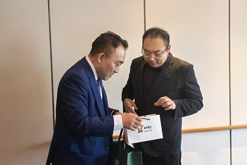 会后,双方互赠具有深厚APEC渊源的纪念礼品。 李成宇副会长向徐鹏主席赠送了韩国2025年APEC领导人峰会官方纪念币套装。徐鹏主席则回赠了美宝烧伤膏(韩国在售版本)以及MIAGE高端护肤品套装。这两份回赠礼品均承载着往届APEC的印记:MIAGE产品是2023年美国旧金山APEC领导人峰会官方礼品袋的重要成员;而美宝烧伤膏则是2024年秘鲁利马APEC领导人峰会的官方礼品之一。此次互赠,不仅体现了双方的情谊,更巧妙地串联起历届APEC峰会的深厚渊源。