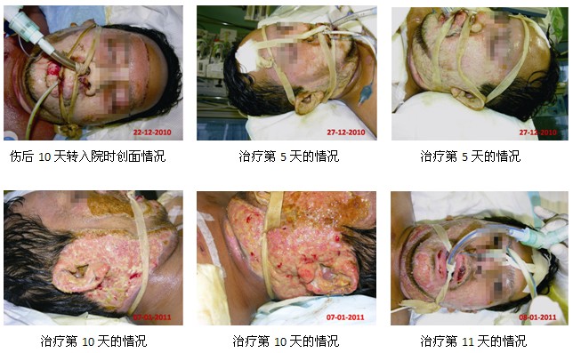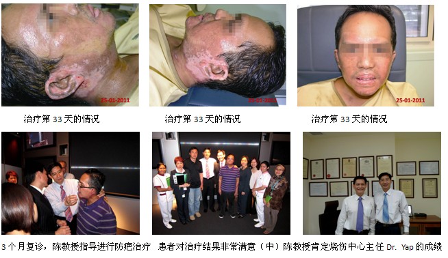 2010年11月,医院收治了一例从外院转来的汽油深度烧伤合并并严重吸入性损伤的患者(TBSA=22%,深II度—浅III度),该患者是一名29岁的工程师,是在工作中被烧伤的,且烧伤部位主要集中在头面部和双上肢等重要功能部位和影响容貌的部位。为了使患者得到更好的恢复容貌和肢体的功能,医院决定采用再生医学技术治疗治疗这例大面积严重烧伤患者,同时,为了更有把握地救治好该患者,烧伤整形中心的主任Dr. Yap Lok Huei马上与中国烧伤创疡科技中心的陈永翀主任取得了联系,陈教授通过电话和电子邮件对该患者进行了治疗指导,医院烧伤中心的医护人员全程采用烧伤再生医学技术对患者进行规范的治疗。经过33天的规范治疗,患者的所有深度烧伤创面不需要植皮全部实现烧伤皮肤原位再生愈合的临床效果。以下是头、面、颈部深度烧伤早期的再生愈合情况和愈合后3个月随访的情况: